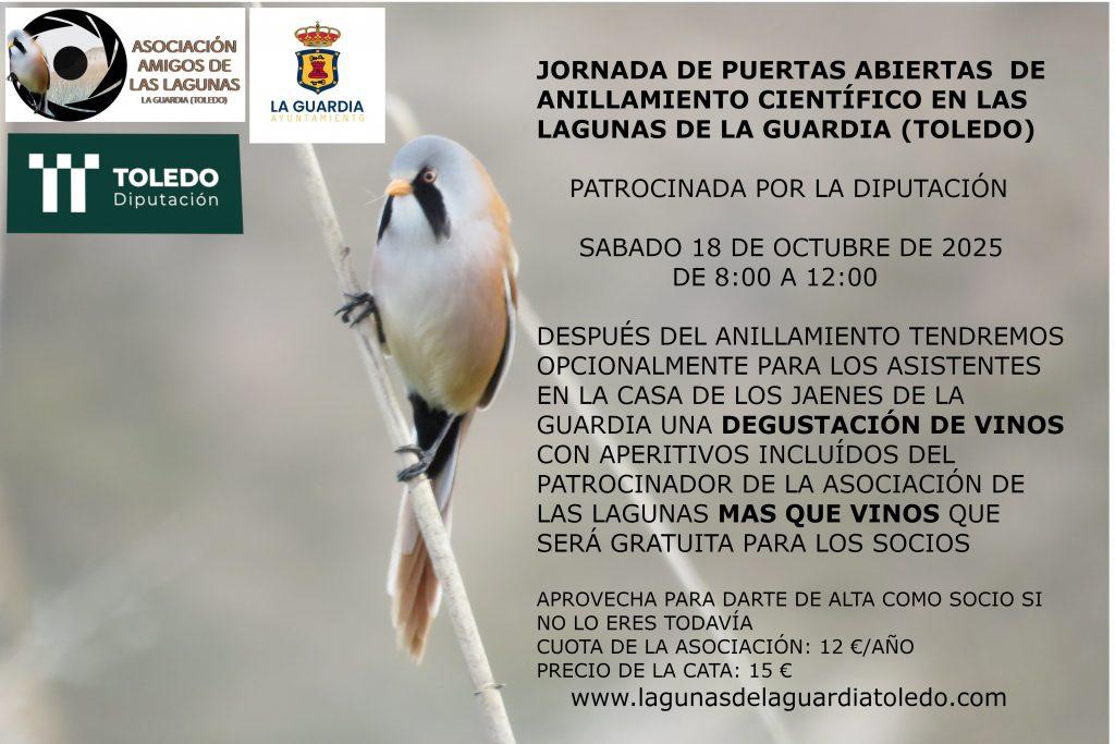 El pasado sábado tuvo lugar una jornada de puertas abiertas de anillamiento científico en las lagunas de La Guardia patrocinada por la Diputación en la que además, después del anillamiento, el patrocinador Más que Vinos realizó para los asistentes al anillamiento una cata de sus vinos en la casa de los Jaenes de La Guardia